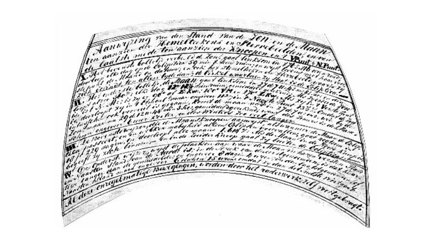 In this part, seven planets (Mercury through Uranus) can be seen revolving about the sun. The periods of their orbits match those of the celestial bodies to within 0.1% (see below for Botjes' table of the values he used). Their relative spacings are also to scale (with the exception of Uranus, which had its orbit truncated to fit on the dial), although the planets themselves are oversized in order to be visible. Saturn, seen here in the lower left, is set apart with a representation of its ring system. Likewise the slight tilt of each planet's orbit is represented to scale and oriented correctly. Finally, the varying distances of the planets from the sun through their orbits is represented by offset circles. (The tilt, orientation, and offset of each orbit is likewise described in Botjes' table).